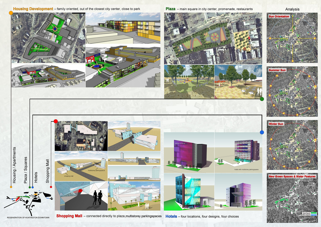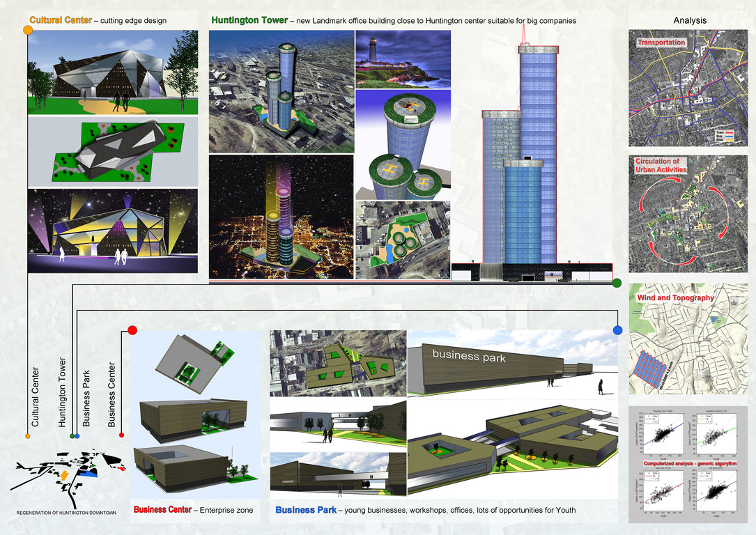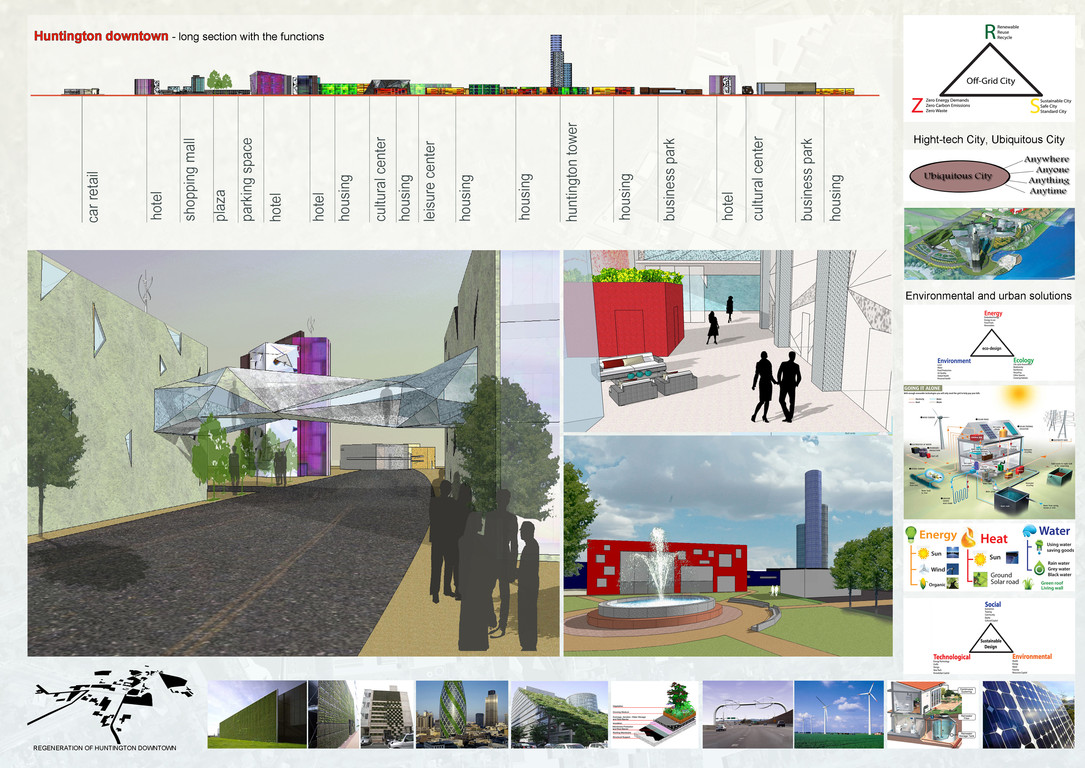 The design project is done in two phases:A-Research and analysis: Location, history, culture, climate,environment, economy, fashion,local architecture,landscape,localhigh-tech, etc.B- Design (Design in theory & Design in action): developing variousideas through brainstorming and computerised methods (ArtificialIntelegence) in order to perform the best possible functions intargeted areas (regarding the plot size, shape and position withinthe city).In detail, a new trade center (Huntington tower), an enterprise zone,four hotels, different types of apartment complexes,a shopping mall,two cultural centers and a leisure complex have been designed.Moreover, new public areas (plaza), green zones and multi-storeyparking spaces have been proposed. Furthermore, new suggestionsfor sustainability, and high-tech city (Ubiqutus city) have beenmade.Reducing the dependency on car by densifying the center anddeveloping a good circulation of urban activities has beenconsidered. In addition, a new transport system has been proposedto improve the commutation options as walking, bike, tram and bus.In summary, new Huntington downtown would be: a vibrant anddynamic place for the youth, attracting investors to bring businessesand lots of new job opportunities.